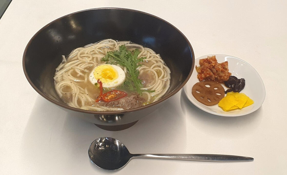 A warm and hearty bowl of udon with premium Busan-style fish cakes, complemented by a side salad and two mini kimbap pieces for a complete dining experience.Dongbaek Beef Udon (동백 차돌우동)